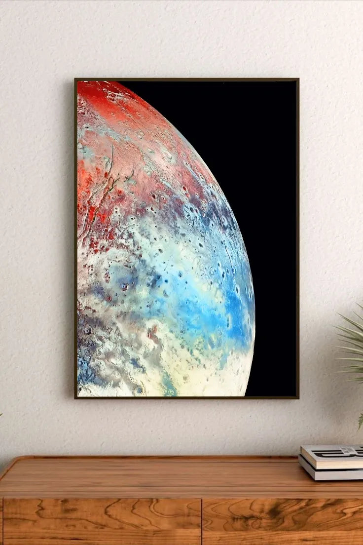 A planetary crust fractured by color, impact, and time.